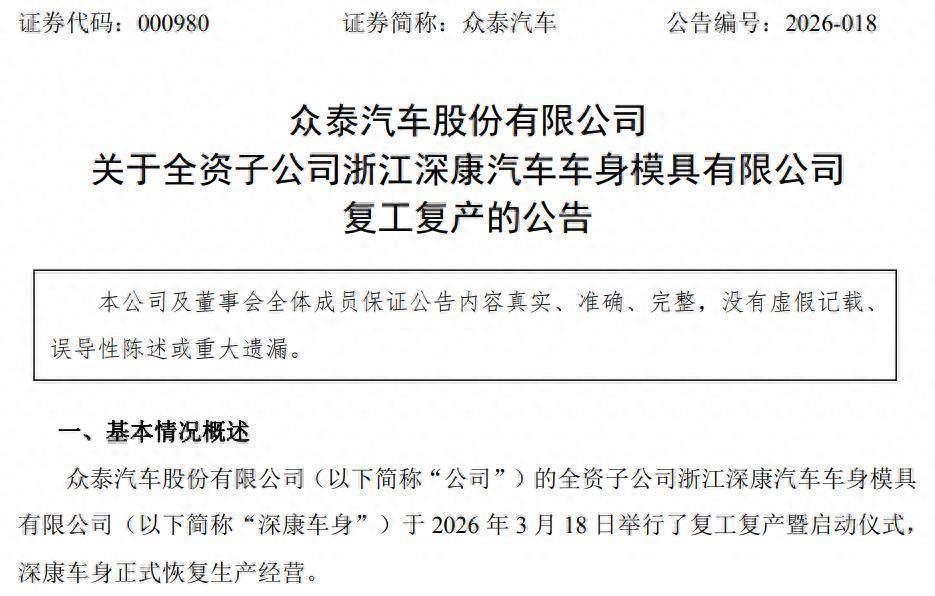 曾经靠高仿豪车一度风光,但其后命运多舛的众泰汽车(000980)迎来一则好消息!3月18日晚间,公司公告称,公司全资子公司浙江深康汽车车身模具有限公司(以下简称“深康车身”)于2026年3月18日举行了复工复产暨启动仪式,深康车身正式恢复生产经营。