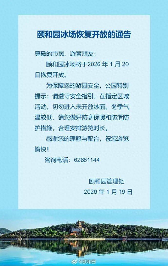 今天,颐和园发布通告:颐和园冰场将于2026年1月20日恢复开放。