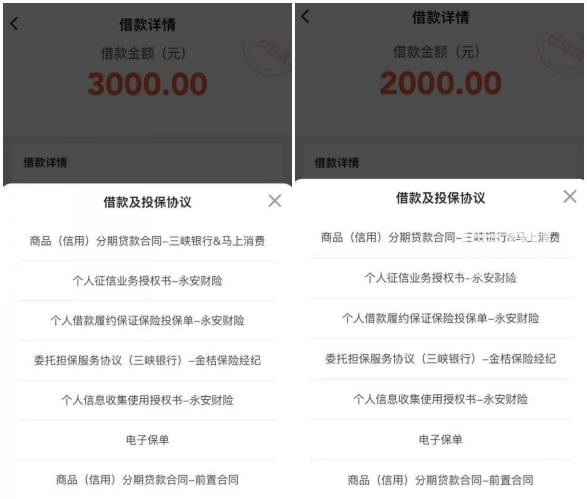 朱先生提供的材料显示,8笔保险业务的保费从54.85元至1265.25元不等,一共约3500元。保费金额与借款本金挂钩,被保险人为放款方之一的重庆三峡银行股份有限公司。但令朱先生费解的是,8笔贷款业务中仅有2笔借款可以在借款详情中找到投保的相关协议痕迹,其余6笔既无保单展示,也没有明确的投保授权文件。“我从未签署过任何与保险相关的文件,这2笔投保的授权文件是怎么来的?剩下的6笔连所谓的授权文件都没有,又是怎么投保的?”