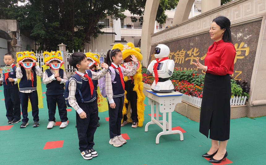 清晨的校园洋溢着喜庆与活力。校门口,欢迎立牌醒目亮眼,LED屏滚动播放温馨开学寄语,AI智能机器人“小锦”与同学们热情互动,萌趣十足。三(7)班同学带来的舞狮与鼓乐表演,铿锵鼓点、灵动狮姿,将新春喜庆与开学喜悦融为一体,营造出热烈浓厚的开学氛围。各班教室也精心布置,简约大方又独具特色,处处彰显积极向上的班级文化和对新学期的美好期盼。