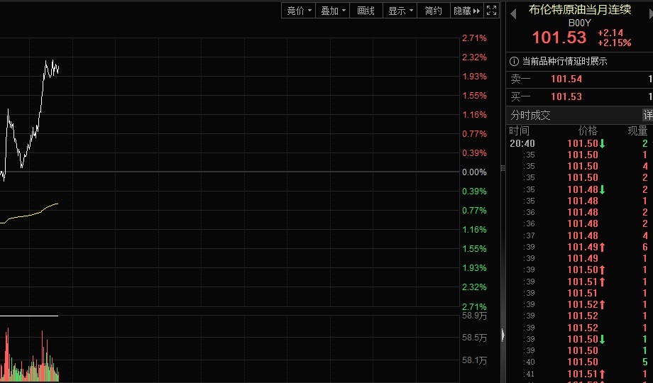 【大河财立方消息】北京时间3月18日晚间,布伦特原油直线拉升。截至发稿专业实盘策略服务,布油当月连续涨超2%,报101.53美元/桶。